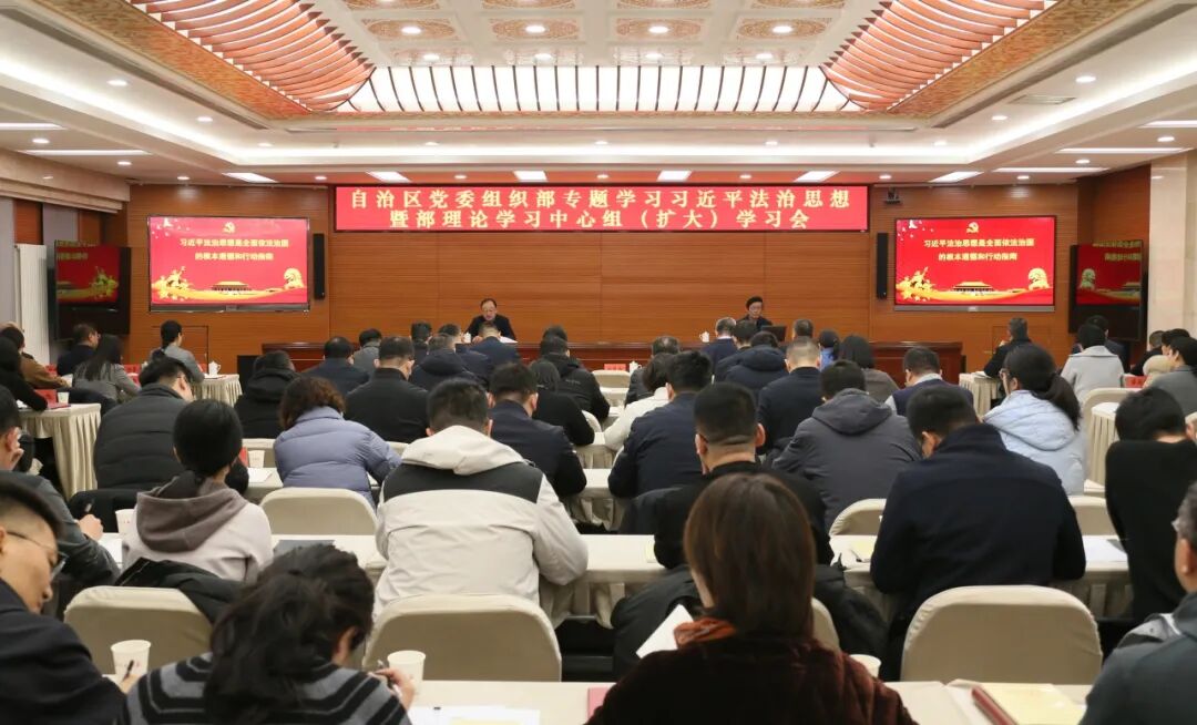 12月19日,自治区党委组织部召开部理论学习中心组(扩大)学习会,深入学习习近平法治思想,学习中央全面依法治国工作会议、自治区党委全面依法治区工作会议精神,邀请自治区人大法制委员会有关负责同志开展专题辅导。