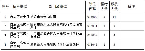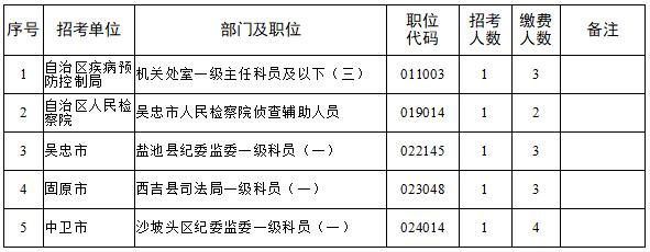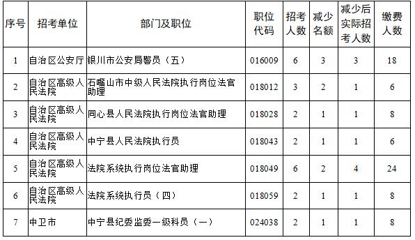 2024年全区考试录用公务员网上报名、资格初审及缴费工作结束后,有部分职位未达到笔试开考比例。根据《宁夏回族自治区2024年考试录用公务员公告》中“笔试开考比例(职位有效报名人数与招录名额之比)一般为5: 1。定向招考职位、专业性较强、生源较少的职位以及艰苦边远地区招考职位笔试开考比例可降至3:1。公安系统法医、特殊紧缺人才职位,监狱机关狱医等专业性强的职位笔试开考比例可降至2:1。达不到笔试开考比例的职位,减少招考名额或取消招考计划。招考计划取消的,报考该职位的考生可改报其他符合条件的职位”的规定,经研究,取消部分职位、减少部分职位招考名额、降低部分职位笔试开考比例。具体如下: